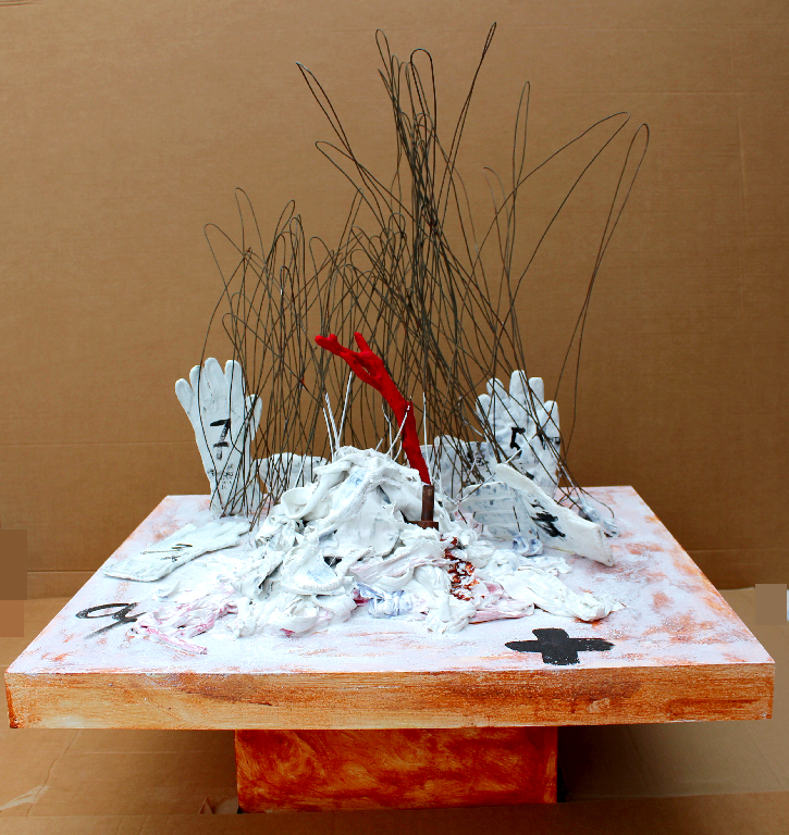 Des lambeaux de tissus sur un plateau ; Lambeaux de nous-même, morceaux de l’éclatement psychologique de la plupart de nos contemporains. Des fils de fer déployés, méandres de l’esprit, chemin de la recherche de soi. Des gants, affirmation d’états d’esprit ou de sentiments, tendus, couchés, à plat, multitude de nous-même dans ce que cela a de meilleur ou de pire. Au milieu de tout cela une forme rouge, érigée comme un signe d’existence. Faite de bois flotté, donc fragile, ayant subi maintes épreuves et souffrances ; Rouge pour dire sa détermination, sa volonté, sa résistance. Lumière vive, incandescente, clairière au milieu d’une forêt de sentiments contradictoires. Un gond rouillé émerge des lambeaux de tissus. Charnière du destin qui fait qu’à un moment tout bascule et nous oblige à considérer la vie autrement, départ d’une évolution et d’une orientation nouvelle.